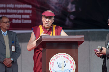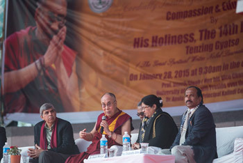 His Holiness the Dalai Lama speaking at University of Delhi's Kalindi College in New Delhi, India on January 28, 2015. Photo/Tenzin Choejor/OHHDL