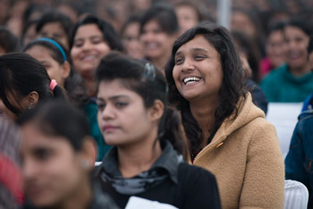Some of the over 2000 students and staff attending His Holiness the Dalai Lama's talk at University of Delhi's Kalindi College in New Delhi, India on January 28, 2015.
