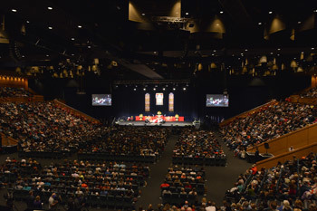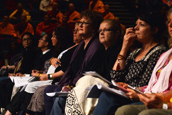 Members of the audience listening to His Holiness the Dalai Lama speaking during the final session of his teaching in Brisbane, Queensland, Australia on June 12, 2015.