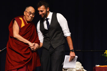 Returning to the same hall after lunch, His Holiness shared the stage with comedian Meshel Laurie and swimmer Ian Thorpe who introduced him to a capacity audience of 4000. His Holiness lost no time in beginning his talk.