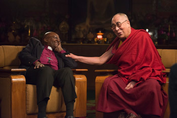 | His Holiness the Dalai Lama and Archbishop Desmond Tutu during the first of several conversations on joy at His Holiness's residence in Dharamsala, HP, India on April 20, 2015. Photo/Tenzin Choejor/OHHDL |