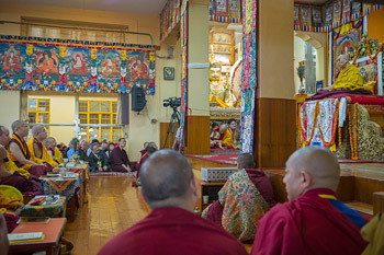 Thekchen Chöling, McLeod Ganj, Dharamsala, HP, India, 20 July 2015 - To begin with this morning, His Holiness the Dalai Lama took his seat below the Tsuglagkhang to observe debates performed by monks and nuns from Nepal. They came from Kopan Monastery, Shelkar Chöde, Chuwar Gaden Dropen Ling, Shri Chusang Gompa, Samtenling Drubgön, Thukje Chöling, Serkong Gaden Jamgonling, and Gosok Phuntsok Chöling, as well as two nunneries, Kyirong Thukje Chöling and Kopan Khechö Gakyil Ling.