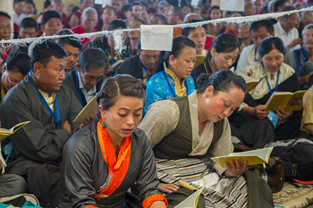 Members of the Tibetan community attending the Long-Life Offering for His Holiness the Dalai Lama at the Tsuglagkhang in Dharamsala, HP, India on July 20, 2015.