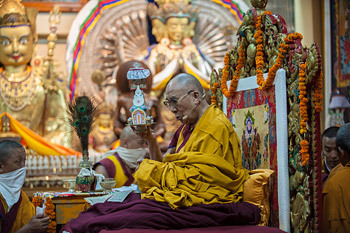 His Holiness the Dalai Lama giving the White Tara empowerment at the Tsuglagkhang in Dharamsala, HP, India on July 20, 2015. Photo/Tenzin Phuntsok/OHHDL