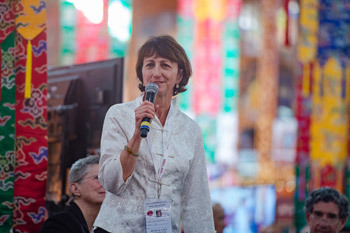 Mind & Life Institute President Susan Bauer-Wu speaking at the start of the Mind & Life XXX conference at Sera Monastery in Bylakuppe, Karnataka, India on December 14, 2015. Photo/Tenzin Choejor/OHHDL