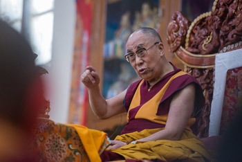 His Holiness the Dalai Lama speaking during his teachings at Gyumey Tantric College in Hunsur, Karnataka, India on December 11, 2015. Photo/Tenzin Choejor/OHHDL