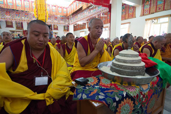 The Chant Master making a traditional mandala offering as the gathered monks chant praises at the start of His Holiness the Dalai Lama's teaching at Gyumey Tantric College in Hunsur, Karnataka, India on December 11, 2015.