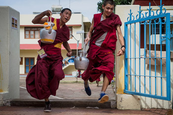 Monks rushing to serve tea to the gathered thousands attending His Holiness the Dalai Lama's teachings at Gyumey Tantric College in Hunsur, Karnataka, India on December 11, 2015. Photo/Tenzin Choejor/OHHDL