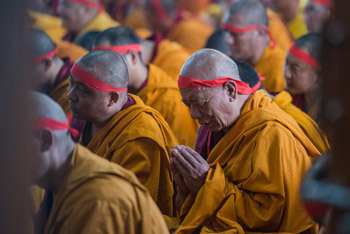 Some of the over 10,000 monastics wearing ritual blindfolds during His Holiness the Dalai Lama's bestowing of the Actual Guhyasamaja Empowerment at Gyumey Tantric College in Hunsur, Karnataka, India on December 11, 2015.