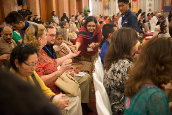 Members of the audience receiving ritual objects during the White Manjushri permission conferred by His Holiness the Dalai Lama in New Delhi, India on March 22, 2015.