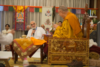 Rajiv Mehrotra expressed thanks to the staff of the Foundation for Universal Responsibility for their hard work in making the event possible. He expressed appreciation of His Holiness’s having accepted the invitation to teach. Finally, he led everyone present in a recitation of a Prayer for His Holiness’s Long Life.