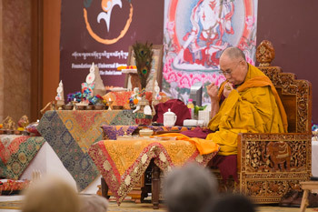 His Holiness the Dalai Lama conducting preparatory rituals before conferring the White Manjushri permission in New Delhi, India on March 22, 2015. Photo/Tenzin Choejor/OHHDL