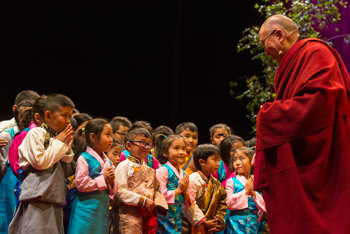 His Holiness the Dalai Lama thanking a group of young Tibetan children who performed before his talk at the O2 Arena in London, England on September 19, 2015. Photo/Ian Cumming