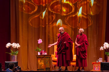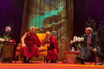 His Holiness the Dalai Lama with his interpreter Geshe Tashi Tsering and moderator Dan Goleman answering questions from the audience during his talk at the O2 Arena in London, England on September 19, 2015. Photo/Ian Cumming