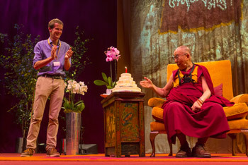 Before the event came to a close, Ian Cumming, who serves as a photographer when His Holiness visits the UK, happens to be a contestant in the Great British Bake-off. He offered His Holiness a cake he’d made for him in this his 80th birthday year and members of the audience sang “Happy Birthday.” His Holiness thanked him and turned back to the audience: