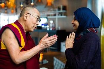 Representatives from the Indian Embassy and students from ISFiT met His Holiness when he landed at Trondheim airport and escorted him to his hotel next door to the Clarion Conference Centre. From the dining room where he enjoyed lunch with a group of students there was a wide view out over a forbidding sea. Before joining the discussions he was introduced to the winner of this year’s Students’ Peace Prize, Aayat Alqormozi, who was awarded it for her unwavering struggle for democracy and human rights in Bahrain.