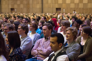 Some of the more than 1800 tudents attending the International Student Festival in Trondheim (ISFiT) listening to His Holiness the Dalai Lama speaking in Trondheim, Norway on February 9, 2015. Photo/foto.samfundet.no
