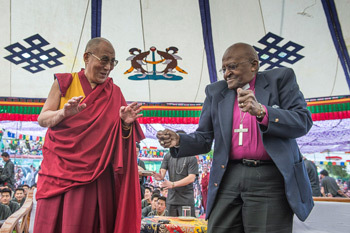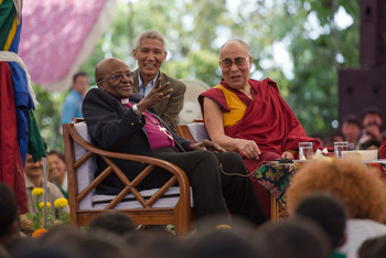 | Archbishop Desmond Tutu speaking to the crowd during his visit with His Holiness the Dalai Lama to Upper Tibetan