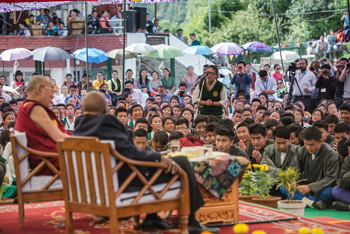 A student asking a question during His Holiness the Dalai Lama and Archbishop Desmond Tutu's visit to Upper Tibetan Children's Village School (TCV) in Dharamsala, HP, India on April 23, 2015. Photo/Tenzin Choejor/OHHDL