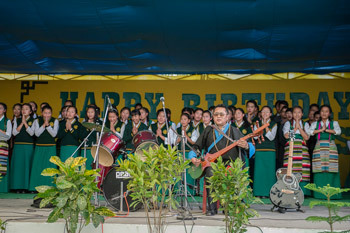 A student band and choir lead a song as His Holiness the Dalai Lama and Archbishop Desmond Tutu arrive at the basketball court at Upper Tibetan Children's Village School (TCV) in Dharamsala, HP, India on April 23, 2015.