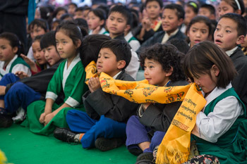 Some of the younger students listening to His Holiness the Dalai Lama and Archibishop Desmond Tutu during their visit to Upper Tibetan Children's Village School (TCV) in Dharamsala, HP, India on April 23, 2015. Photo/Tenzin Choejor/OHHDL