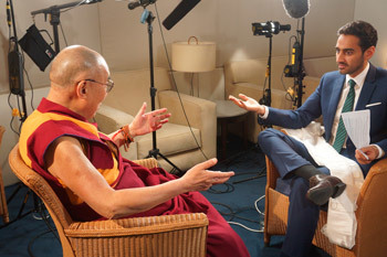 His Holiness the Dalai Lama giving an interview to Waleed Aly of Network Ten TV in Sydney, Australia on June 4, 2015. Photo/Jeremy Russell/OHHDL