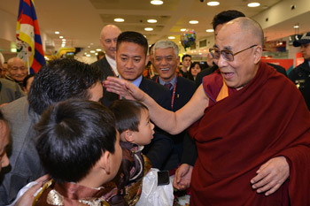His Holiness the Dalai Lama greeting Tibetans that gathered in the airport lobby to welcome him on his arrival to Sydney, Australia on June 4, 2015. Photo/Rusty Stewart