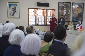 His Holiness the Dalai Lama speaking at the Missionaries of Charity's Mother House in Kolkata, West Bengal, India on January 12, 2015. Photo/Tenzin Choejor/OHHDL