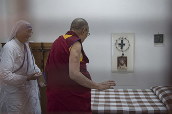 Everyone present expressed pleasure at his spontaneous visit with laughter and applause. His Holiness spoke admiringly of the way the Sisters serve humanity, particularly by caring for the poorest of the poor. He also recalled the one brief occasion on which he met Mother Teresa, describing her as an exemplary person, who revealed to others the true practice of love through her charitable activities. He said that although she is no longer physically among us, her spirit lives on as does the spirit of Jesus Christ and Buddha Shakyamuni. His Holiness urged the gathering to continue serving people, especially the poor and needy in that spirit. He asked all those present to consider that they were working for the entire family of 7 billion human beings with the aim of making this 21st century an era of peace.