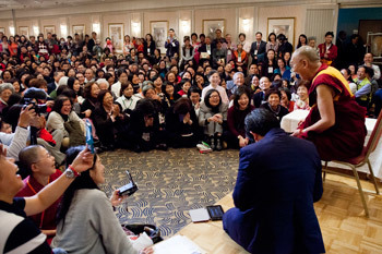His Holiness the Dalai Lama speaking to a group of Taiwanese in Tokyo, Japan on April 14, 2015. Photo/Tenzin Jigmey