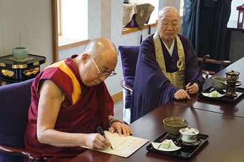 The drive from Tokyo station to Souji Temple in Yokahama on Tokyo’s congested roads was considerably slower. His Holiness was received by the Chief Priests of the temple and escorted into the main Buddha hall where he paid his respects before joining them for a traditional Japanese lunch. At their meeting afterwards, they explained that the temple is observing a memorial year to commemorate their founder, Taiso Josai Daishi. His Holiness inscribed two messages for the temple as a memento of his visit and gifts were exchanged.