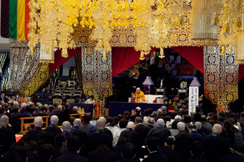 The buildings of the temple complex are interconnected by covered wooden corridors that run through the picturesque gardens. His Holiness was escorted along them and welcomed with applause as he entered the assembly hall in which 1800 people were waiting to hear him. Speaking in Tibetan that was then translated into Japanese, he reminded them that as human beings we are all the same. We all want happiness and shun suffering. And although we may feel happy and content to sit and listen to a talk in the temple here, in other parts of the world there are people in misery.