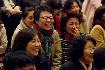 Members of the audience reacting to His Holiness the Dalai Lama's talk at Souji Temple's assembly hall in Tokyo, Japan on April 11, 2015. Photo/Tenzin Jigmey