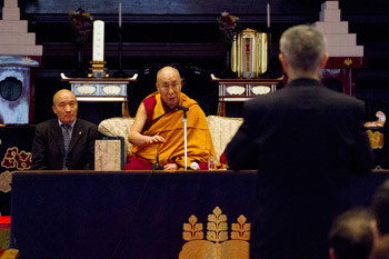 He told a man who wanted to know how to help his mother, who has fallen ill with leukaemia, to laugh again, that he would give him Tibetan medicine that could help and would that he would pray for her. When a woman who practises Zazen daily asked if doing so would be effective in spreading Buddhism, His Holiness said that spreading Buddhism is not his intention. He is more interested is making people aware of secular ethics on the basis of common sense, our common experience and scientific findings.