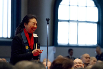 A member of the audience asking His Holiness the Dalai Lama a question during his talk at Souji Temple in Tokyo, Japan on April 11, 2015. Photo/Tenzin Jigmey