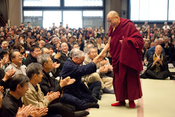 His Holiness the Dalai Lama shaking hands with members of the audience as he leaves the main assembly hall of Souji Souji Temple at the conclusion of his talk in Tokyo, Japan on April 11, 2015. Photo/Tenzin Jigmey