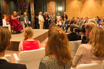 He explained again that whenever he speaks in public he thinks of himself as just another human being the same as everyone else. He said that if he thinks of himself as a Buddhist, as someone from Asia or as His Holiness the 14th Dalai Lama it only serves to create a distance between him and the people he's talking to. He stressed that it is on the basis of what they have in common that every individual has a responsibility to think of the well-being of all 7 billion human beings alive today. It's in this context, he said, that he regrets that the existing education system is oriented towards materialism with little place for inner values.