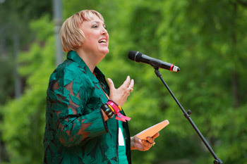 Green Party member Claudia Roth speaking before His Holiness the Dalai Lama's talk at Wiesbaden Kupark in Wiesbaden, Hessen, Germany on July 12, 2015.
