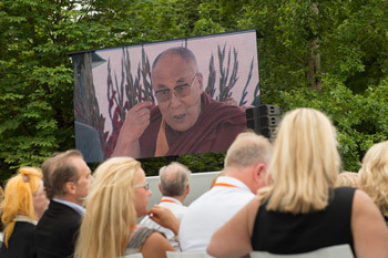 Members of the audience watching His Holiness the Dalai Lama on a big screen during his talk at Wiesbaden Kupark in Wiesbaden, Hessen, Germany on July 12, 2015.