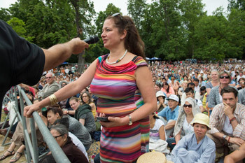 A member of the audience asking His Holiness the Dalai Lama a question during his talk at Wiesbaden Kupark in Wiesbaden, Hessen, Germany on July 12, 2015. Photo/Manuel Bauer