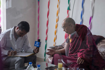 | Anil Patwa interviewing His Holiness the Dalai Lama in Kangra, HP, India on May 9, 2015. Photo/Tenzin Choejor/OHHDL |