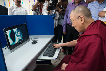 His Holiness the Dalai Lama launching the app Himachalabhiabhi.com during his visit to Kangra, HP, India on May 9, 2015. Photo/Tenzin Choejor/OHHDL