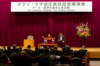 Tokyo, Japan, 4 April 2015 - Having returned to Tokyo from Sapporo this morning, this afternoon His Holiness the Dalai Lama was invited to address not only the live audience in the Japan Doctors Association Hall, but also another 166,000 members across the country online. Moved by the formality of the 500 grave-faced, besuited physicians before him, His Holiness declared that while he usually speaks in English, he would begin in his own Tibetan language. He told them how happy he was to be with them and remarked that although the President of the Japan Doctors Association (JDA) had referred in his introduction to the Dalai Lamas being bodhisattvas, he prefers to think of himself as just a human being. Switching to English, he continued: