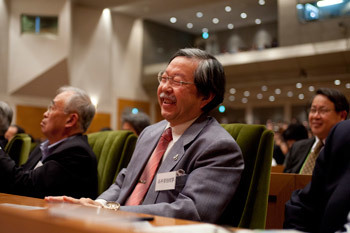 Members of the audience listening to His Holiness the Dalai Lama speaking at the Japan Doctors Association Hall in Tokyo, Japan on April 4, 2015. Photo/Tenzin Jigmey