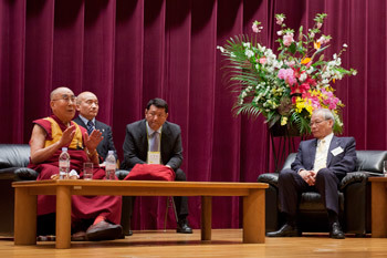 The first question from the audience asked how we can deal with difficulties we will face in the future. In his reply His Holiness acknowledged that since 1 billion among the 7 billion human beings alive today assert that they adhere to no religious faith, we need to look for new ways to promote a sense of love and affection. All of us, even those who eventually become terrorists, grow up under our mother’s care and affection. But as we grow our natural sense of affection seems to decline. He suggested following the Indian example of taking a secular approach to ethics. This is an approach that respects religious traditions and even the views of those who have no faith, without depending on any of them. He told his listeners that curriculums are being developed with a view to introducing ethics with a secular, universal appeal into our general education systems.