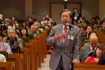 A member of the audience asking His Holiness the Dalai Lama a question during his talk at the Japan Doctors Association Hall in Tokyo, Japan on April 4, 2015. Photo/Tenzin Jigmey