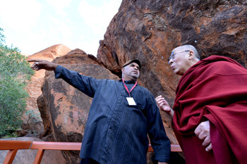 After a cool night, the sun was bright and beginning to warm the land as he drove out to the Uluru-Kata Tjuta National Park. He was met and welcomed by the Chairman of the Traditional Owners’ Board, Sammy, an interpreter, Kathryn Tozer, and Park Staff. They began to walk together towards the Mutitjulu Waterhole, answering his questions on the way. The great red sandstone Uluru rock foundation towering over the surrounding flat desert dominates the place. His Holiness wanted to know about the vegetation, the local wildlife and, once a pair of binoculars was found, spent some time examining the rock-face from below.