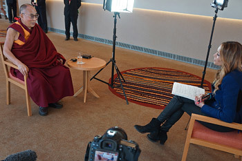 Karla Grant, presenter of Living Black for SBS, interviewing His Holiness the Dalai Lama in Uluru, Northern Territory, Australia on June 13, 2015. Photo/Jeremy Russell/OHHDL