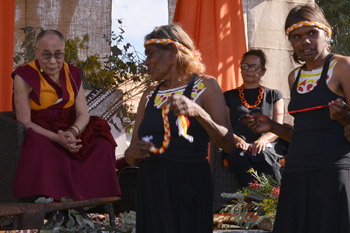 His Holiness made a brief visit to the National Indigenous Training Academy on the way to the Yulara Oval where he was to address a crowd of more than 3000. There was enthusiastic applause as he took the stage. Shortly afterwards members of the Matitjulu community welcomed him onto the land. Firstly a group of women danced while a group sitting on the ground played and sang. They were followed by one man decorated with body paint dancing alone. It was explained that this was an expression of part of their creation stories.