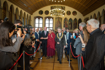 Frankfurt, Hesse, Germany, 13 July 2015 - Arriving at Frankfurt City Hall this morning, His Holiness the Dalai Lama was received by the Lord Mayor, Peter Feldmann, who escorted him into the building and up to his office. After a short private meeting, they emerged for a reception in a hall lined with portraits of former German kings. Joined by other members of the Municipal Authority, the Lord Mayor welcomed His Holiness to Frankfurt: